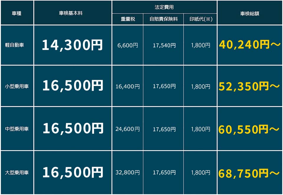 ※2 認証工場での車検の場合、印紙代は軽自動車2,200円、5ナンバー車は2,200円、3ナンバー車は2,300円となります。